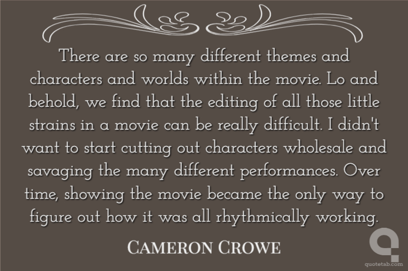 There are so many different themes and characters and worlds within the movie, ... Lo and behold, we find that the editing of all those little strains in a movie can be really difficult. I didn't want to start cutting out characters wholesale and savaging the many different performances. Over time, showing the movie became the only way to figure out how it was all rhythmically working.