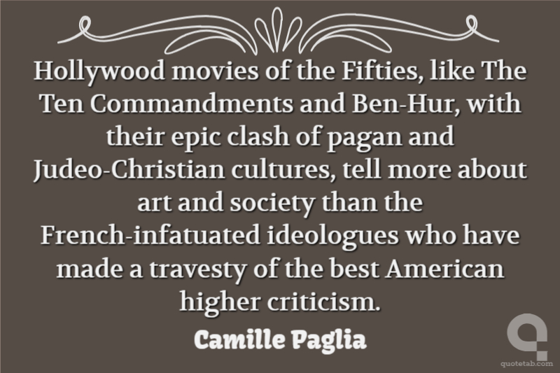 Hollywood movies of the Fifties, like The Ten Commandments and Ben-Hur, with their epic clash of pagan and Judeo-Christian cultures, tell more about art and society than the French-infatuated ideologues who have made a travesty of the best American higher criticism.