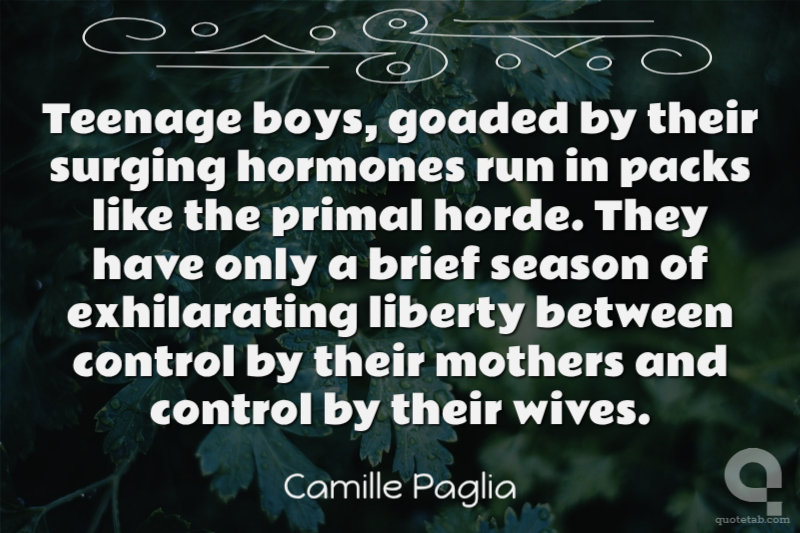Teenage boys, goaded by their surging hormones run in packs like the primal horde. They have only a brief season of exhilarating liberty between control by their mothers and control by their wives.