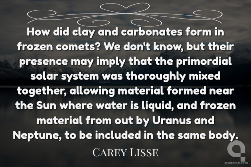 How did clay and carbonates form in frozen comets? We don't know, but their presence may imply that the primordial solar system was thoroughly mixed together, allowing material formed near the Sun where water is liquid, and frozen material from out by Uranus and Neptune, to be included in the same body.