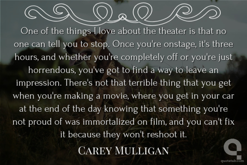 One of the things I love about the theater is that no one can tell you to stop. Once you're onstage, it's three hours, and whether you're completely off or you're just horrendous, you've got to find a way to leave an impression. There's not that terrible thing that you get when you're making a movie, where you get in your car at the end of the day knowing that something you're not proud of was immortalized on film, and you can't fix it because they won't reshoot it.