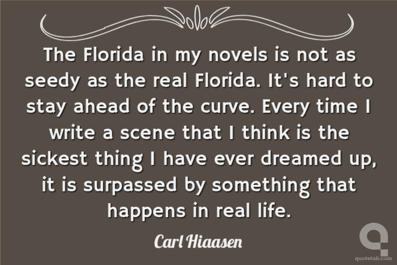 The Florida in my novels is not as seedy as the real Florida. It's hard to stay ahead of the curve. Every time I write a scene that I think is the sickest thing I have ever dreamed up, it is surpassed by something that happens in real life.