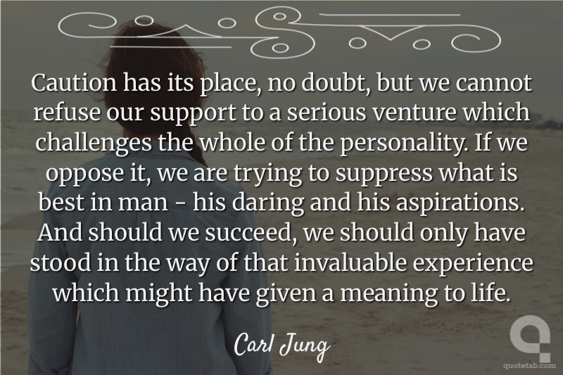Caution has its place, no doubt, but we cannot refuse our support to a serious venture which challenges the whole of the personality. If we oppose it, we are trying to suppress what is best in man - his daring and his aspirations. And should we succeed, we should only have stood in the way of that invaluable experience which might have given a meaning to life.
