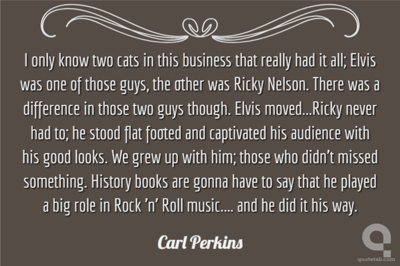 I only know two cats in this business that really had it all; Elvis was one of those guys, the other was Ricky Nelson. There was a difference in those two guys though. Elvis moved...Ricky never had to; he stood flat footed and captivated his audience with his good looks. We grew up with him; those who didn't missed something. History books are gonna have to say that he played a big role in Rock 'n' Roll music.... and he did it his way.