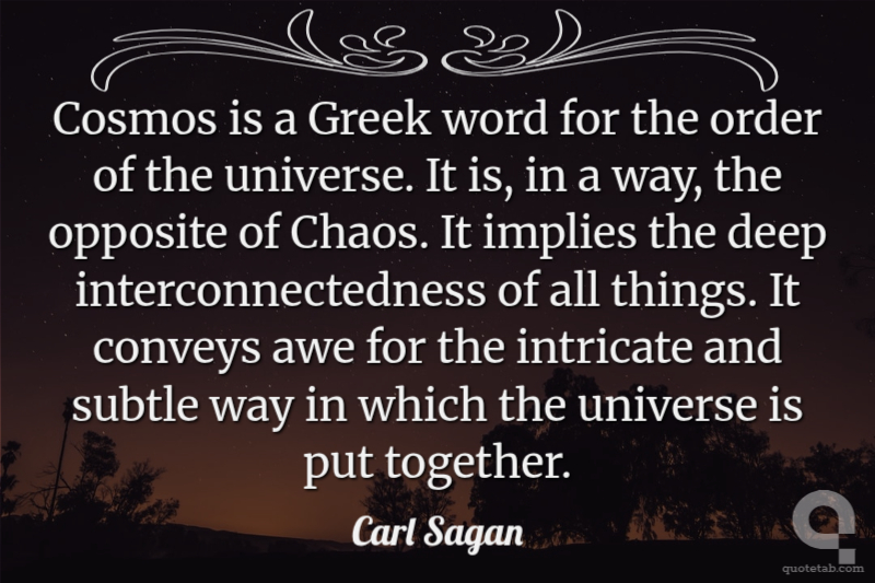 Cosmos is a Greek word for the order of the universe. It is, in a way, the opposite of Chaos. It implies the deep interconnectedness of all things. It conveys awe for the intricate and subtle way in which the universe is put together.