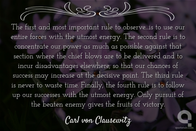 The first and most important rule to observe...is to use our entire forces with the utmost energy. The second rule is to concentrate our power as much as possible against that section where the chief blows are to be delivered and to incur disadvantages elsewhere, so that our chances of success may increase at the decisive point. The third rule is never to waste time. Finally, the fourth rule is to follow up our successes with the utmost energy. Only pursuit of the beaten enemy gives the fruits of victory.