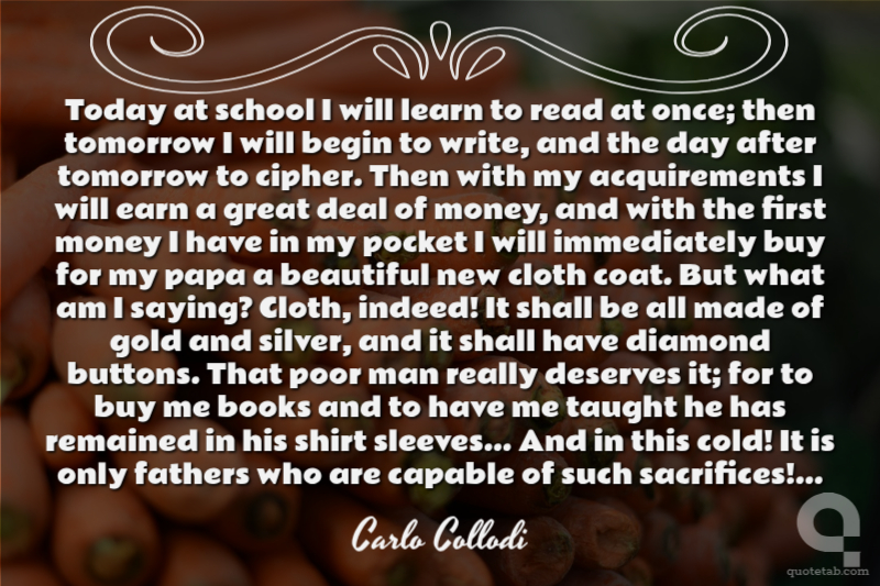 Today at school I will learn to read at once; then tomorrow I will begin to write, and the day after tomorrow to cipher. Then with my acquirements I will earn a great deal of money, and with the first money I have in my pocket I will immediately buy for my papa a beautiful new cloth coat. But what am I saying? Cloth, indeed! It shall be all made of gold and silver, and it shall have diamond buttons. That poor man really deserves it; for to buy me books and to have me taught he has remained in his shirt sleeves... And in this cold! It is only fathers who are capable of such sacrifices!...