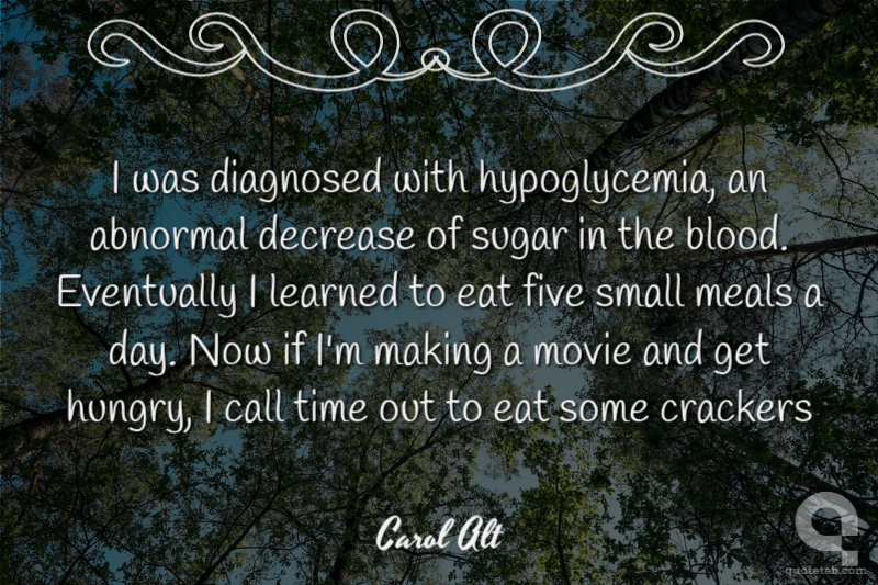 I was diagnosed with hypoglycemia, an abnormal decrease of sugar in the blood. Eventually I learned to eat five small meals a day. Now if I'm making a movie and get hungry, I call time out to eat some crackers
