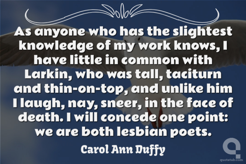 As anyone who has the slightest knowledge of my work knows, I have little in common with Larkin, who was tall, taciturn and thin-on-top, and unlike him I laugh, nay, sneer, in the face of death. I will concede one point: we are both lesbian poets.