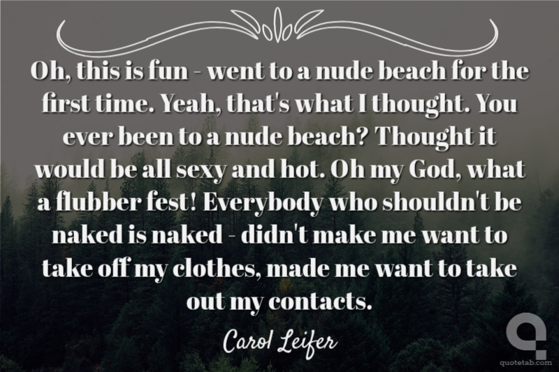 Oh, this is fun - went to a nude beach for the first time. Yeah, that's what I thought. You ever been to a nude beach? Thought it would be all sexy and hot. Oh my God, what a flubber fest! Everybody who shouldn't be naked is naked - didn't make me want to take off my clothes, made me want to take out my contacts.
