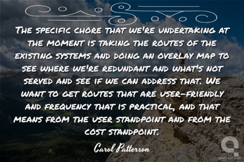 The specific chore that we're undertaking at the moment is taking the routes of the existing systems and doing an overlay map to see where we're redundant and what's not served and see if we can address that. We want to get routes that are user-friendly and frequency that is practical, and that means from the user standpoint and from the cost standpoint.