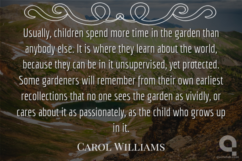 Usually, children spend more time in the garden than anybody else. It is where they learn about the world, because they can be in it unsupervised, yet protected. Some gardeners will remember from their own earliest recollections that no one sees the garden as vividly, or cares about it as passionately, as the child who grows up in it.