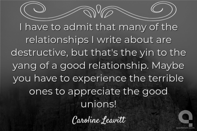 I have to admit that many of the relationships I write about are destructive, but that's the yin to the yang of a good relationship. Maybe you have to experience the terrible ones to appreciate the good unions!