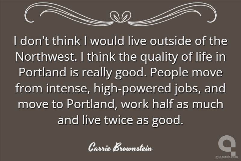 I don't think I would live outside of the Northwest. I think the quality of life in Portland is really good. People move from intense, high-powered jobs, and move to Portland, work half as much and live twice as good.