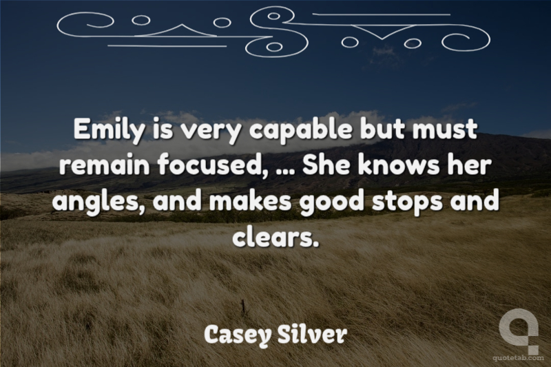 Emily is very capable but must remain focused, ... She knows her angles, and makes good stops and clears.