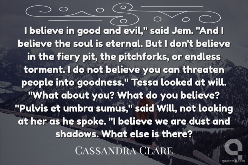 I believe in good and evil," said Jem. "And I believe the soul is eternal. But I don't believe in the fiery pit, the pitchforks, or endless torment. I do not believe you can threaten people into goodness." Tessa looked at will. "What about you? What do you believe? "Pulvis et umbra sumus," said Will, not looking at her as he spoke. "I believe we are dust and shadows. What else is there?