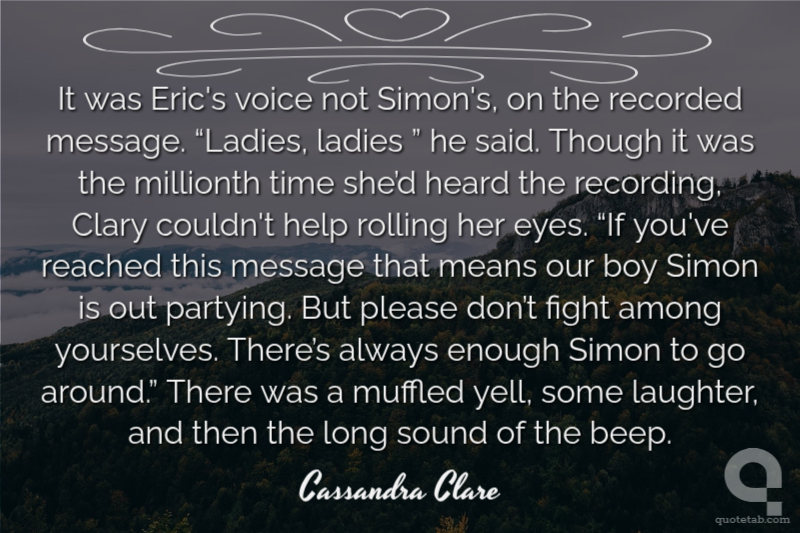 It was Eric's voice not Simon's, on the recorded message. “Ladies, ladies ” he said. Though it was the millionth time she’d heard the recording, Clary couldn't help rolling her eyes. “If you've reached this message that means our boy Simon is out partying. But please don’t fight among yourselves. There’s always enough Simon to go around.” There was a muffled yell, some laughter, and then the long sound of the beep.