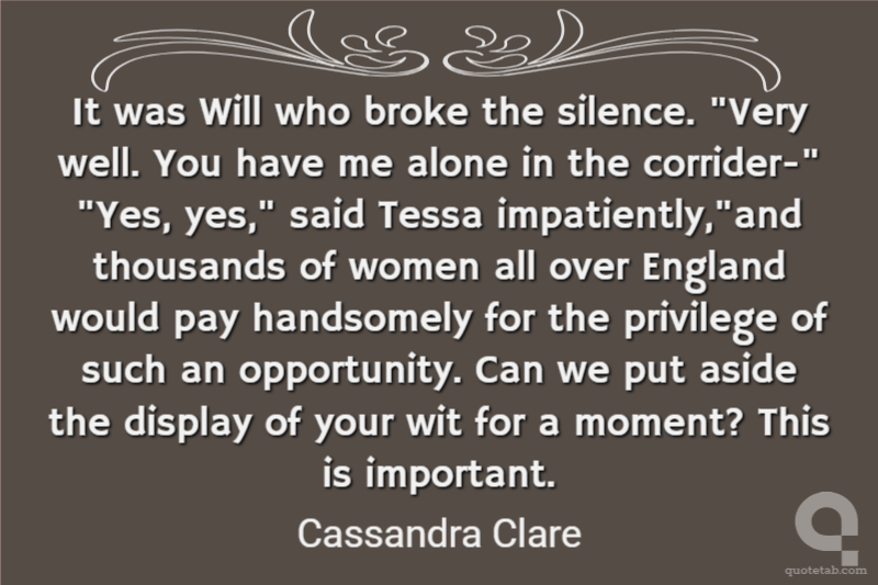 It was Will who broke the silence. "Very well. You have me alone in the corrider-" "Yes, yes," said Tessa impatiently,"and thousands of women all over England would pay handsomely for the privilege of such an opportunity. Can we put aside the display of your wit for a moment? This is important.