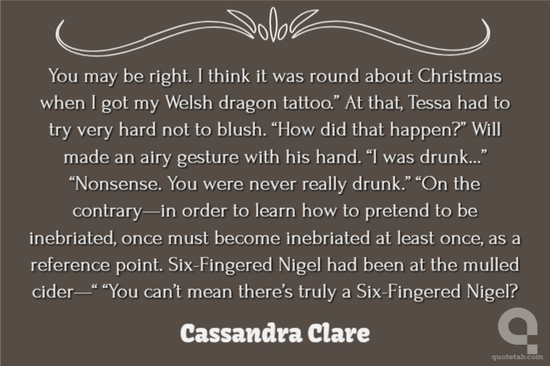 You may be right. I think it was round about Christmas when I got my Welsh dragon tattoo.” At that, Tessa had to try very hard not to blush. “How did that happen?” Will made an airy gesture with his hand. “I was drunk…” “Nonsense. You were never really drunk.” “On the contrary—in order to learn how to pretend to be inebriated, once must become inebriated at least once, as a reference point. Six-Fingered Nigel had been at the mulled cider—“ “You can’t mean there’s truly a Six-Fingered Nigel?