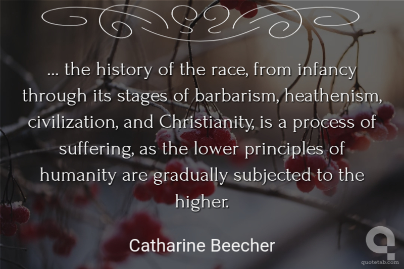 ... the history of the race, from infancy through its stages of barbarism, heathenism, civilization, and Christianity, is a process of suffering, as the lower principles of humanity are gradually subjected to the higher.