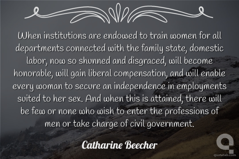 When institutions are endowed to train women for all departments connected with the family state, domestic labor, now so shunned and disgraced, will become honorable, will gain liberal compensation, and will enable every woman to secure an independence in employments suited to her sex. And when this is attained, there will be few or none who wish to enter the professions of men or take charge of civil government.