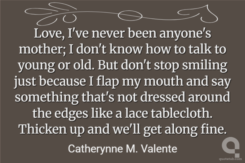 Love, I've never been anyone's mother; I don't know how to talk to young or old. But don't stop smiling just because I flap my mouth and say something that's not dressed around the edges like a lace tablecloth. Thicken up and we'll get along fine.