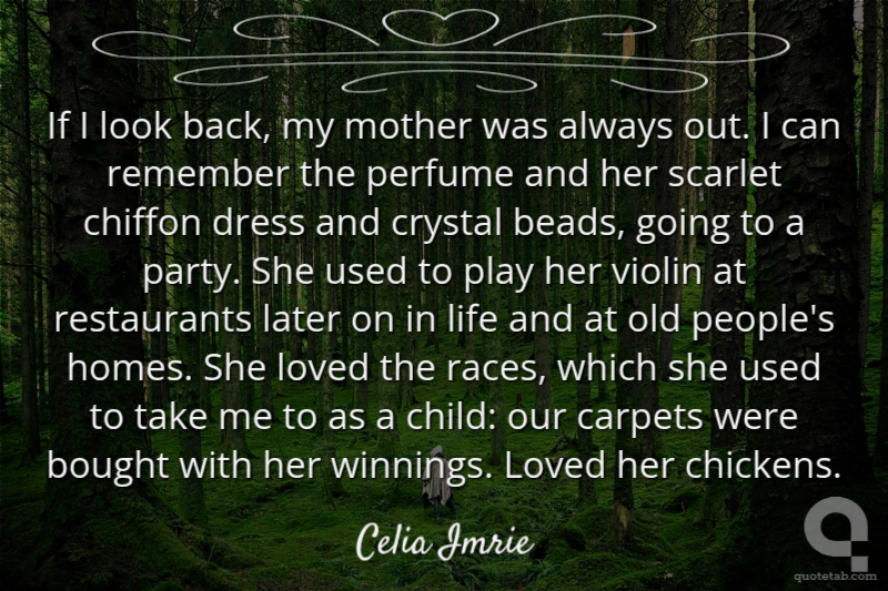 If I look back, my mother was always out. I can remember the perfume and her scarlet chiffon dress and crystal beads, going to a party. She used to play her violin at restaurants later on in life and at old people's homes. She loved the races, which she used to take me to as a child: our carpets were bought with her winnings. Loved her chickens.