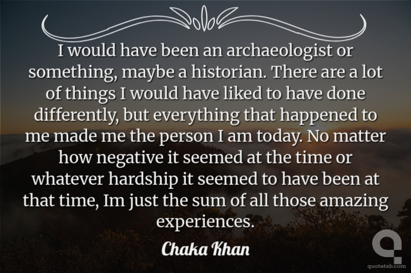 I would have been an archaeologist or something, maybe a historian. There are a lot of things I would have liked to have done differently, but everything that happened to me made me the person I am today. No matter how negative it seemed at the time or whatever hardship it seemed to have been at that time, Im just the sum of all those amazing experiences.