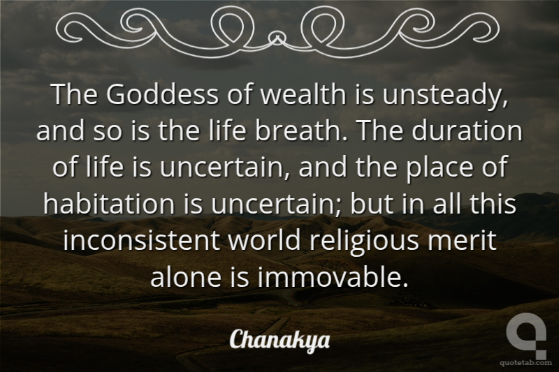 The Goddess of wealth is unsteady, and so is the life breath. The duration of life is uncertain, and the place of habitation is uncertain; but in all this inconsistent world religious merit alone is immovable.