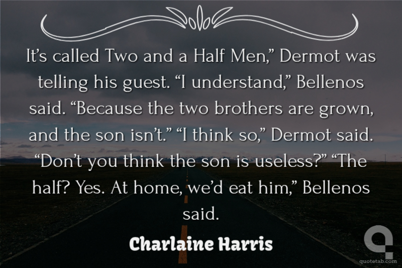 It’s called Two and a Half Men,” Dermot was telling his guest. “I understand,” Bellenos said. “Because the two brothers are grown, and the son isn’t.” “I think so,” Dermot said. “Don’t you think the son is useless?” “The half? Yes. At home, we’d eat him,” Bellenos said.