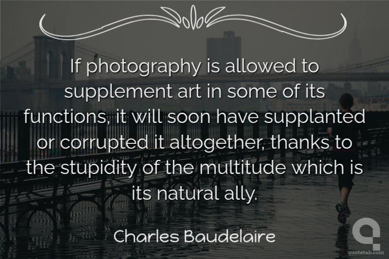 If photography is allowed to supplement art in some of its functions, it will soon have supplanted or corrupted it altogether, thanks to the stupidity of the multitude which is its natural ally.
