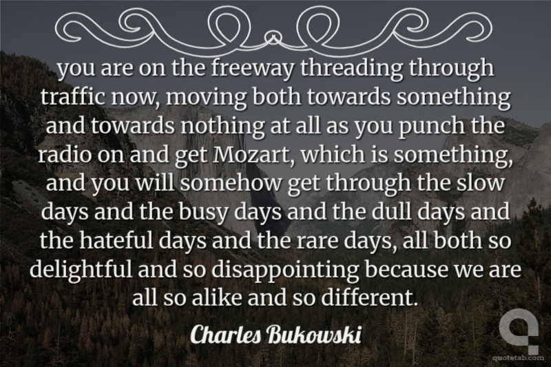 you are on the freeway threading through traffic now, moving both towards something and towards nothing at all as you punch the radio on and get Mozart, which is something, and you will somehow get through the slow days and the busy days and the dull days and the hateful days and the rare days, all both so delightful and so disappointing because we are all so alike and so different.