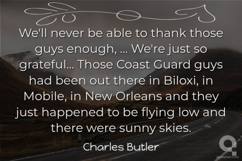 We'll never be able to thank those guys enough, ... We're just so grateful... Those Coast Guard guys had been out there in Biloxi, in Mobile, in New Orleans and they just happened to be flying low and there were sunny skies.