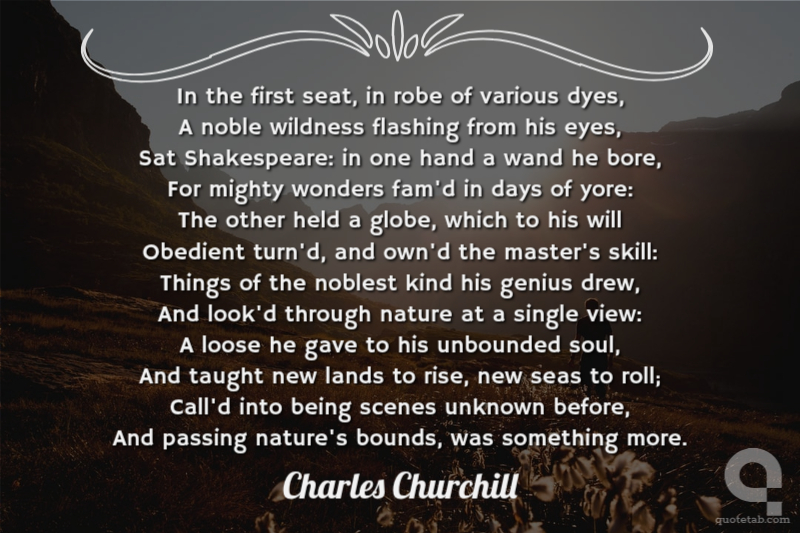 In the first seat, in robe of various dyes, A noble wildness flashing from his eyes, Sat Shakespeare: in one hand a wand he bore, For mighty wonders fam'd in days of yore: The other held a globe, which to his will Obedient turn'd, and own'd the master's skill: Things of the noblest kind his genius drew, And look'd through nature at a single view: A loose he gave to his unbounded soul, And taught new lands to rise, new seas to roll; Call'd into being scenes unknown before, And passing nature's bounds, was something more.