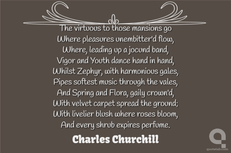 The virtuous to those mansions go Where pleasures unembitter'd flow, Where, leading up a jocund band, Vigor and Youth dance hand in hand, Whilst Zephyr, with harmonious gales, Pipes softest music through the vales, And Spring and Flora, gaily crown'd, With velvet carpet spread the ground; With livelier blush where roses bloom, And every shrub expires perfume.