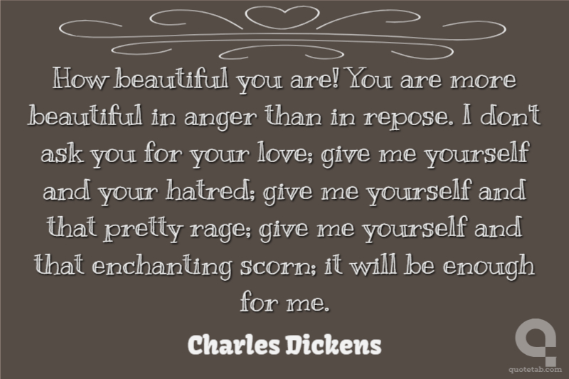 How beautiful you are! You are more beautiful in anger than in repose. I don't ask you for your love; give me yourself and your hatred; give me yourself and that pretty rage; give me yourself and that enchanting scorn; it will be enough for me.