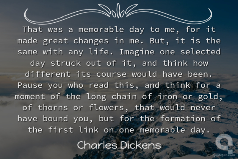 That was a memorable day to me, for it made great changes in me. But, it is the same with any life. Imagine one selected day struck out of it, and think how different its course would have been. Pause you who read this, and think for a moment of the long chain of iron or gold, of thorns or flowers, that would never have bound you, but for the formation of the first link on one memorable day.