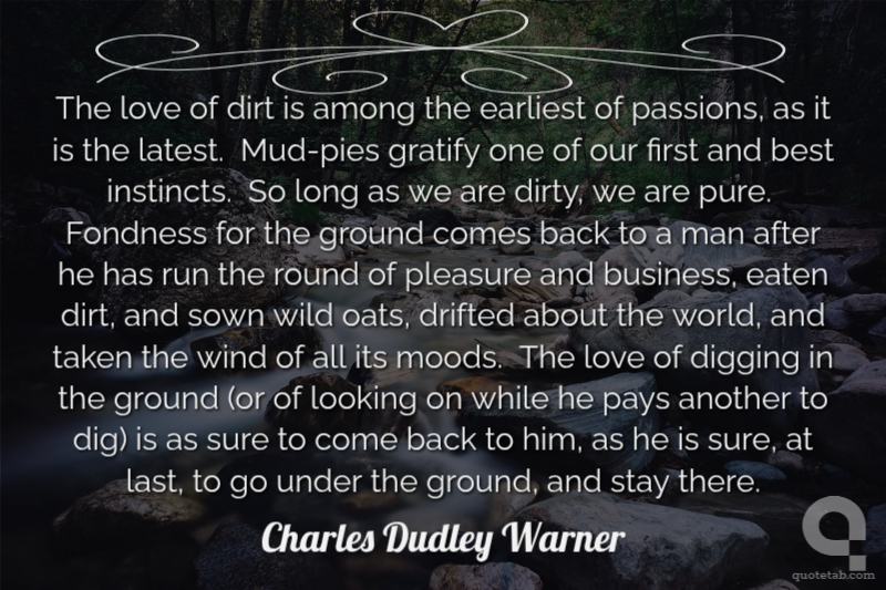 The love of dirt is among the earliest of passions, as it is the latest. Mud-pies gratify one of our first and best instincts. So long as we are dirty, we are pure. Fondness for the ground comes back to a man after he has run the round of pleasure and business, eaten dirt, and sown wild oats, drifted about the world, and taken the wind of all its moods. The love of digging in the ground (or of looking on while he pays another to dig) is as sure to come back to him, as he is sure, at last, to go under the ground, and stay there.