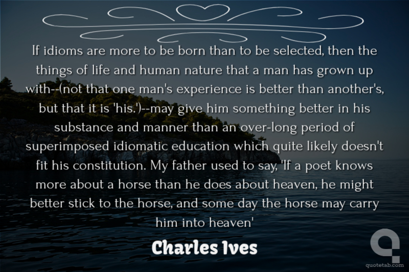 If idioms are more to be born than to be selected, then the things of life and human nature that a man has grown up with--(not that one man's experience is better than another's, but that it is 'his.')--may give him something better in his substance and manner than an over-long period of superimposed idiomatic education which quite likely doesn't fit his constitution. My father used to say, 'If a poet knows more about a horse than he does about heaven, he might better stick to the horse, and some day the horse may carry him into heaven'