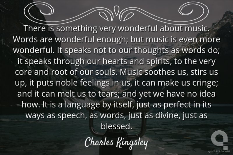 There is something very wonderful about music. Words are wonderful enough; but music is even more wonderful. It speaks not to our thoughts as words do; it speaks through our hearts and spirits, to the very core and root of our souls. Music soothes us, stirs us up, it puts noble feelings in us, it can make us cringe; and it can melt us to tears; and yet we have no idea how. It is a language by itself, just as perfect in its ways as speech, as words, just as divine, just as blessed.