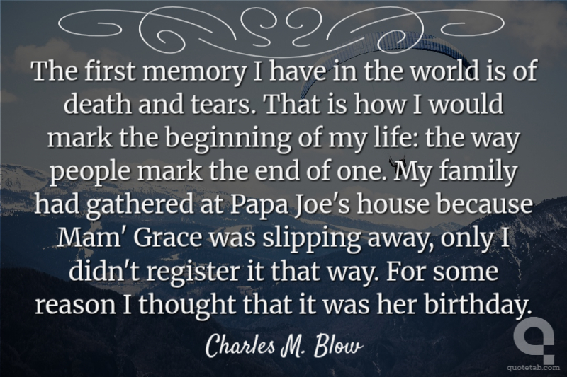 The first memory I have in the world is of death and tears. That is how I would mark the beginning of my life: the way people mark the end of one. My family had gathered at Papa Joe's house because Mam' Grace was slipping away, only I didn't register it that way. For some reason I thought that it was her birthday.