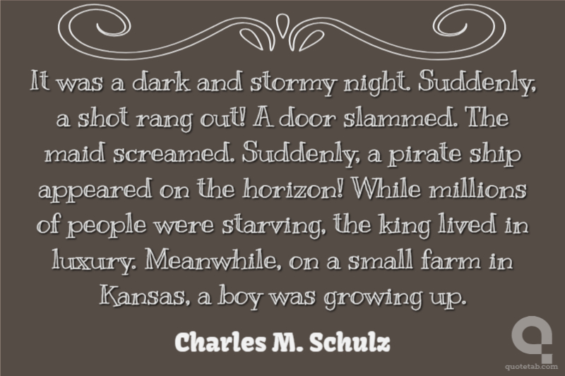 It was a dark and stormy night. Suddenly, a shot rang out! A door slammed. The maid screamed. Suddenly, a pirate ship appeared on the horizon! While millions of people were starving, the king lived in luxury. Meanwhile, on a small farm in Kansas, a boy was growing up.