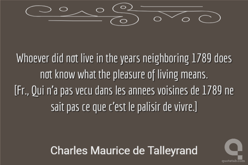 Whoever did not live in the years neighboring 1789 does not know what the pleasure of living means. [Fr., Qui n'a pas vecu dans les annees voisines de 1789 ne sait pas ce que c'est le palisir de vivre.]