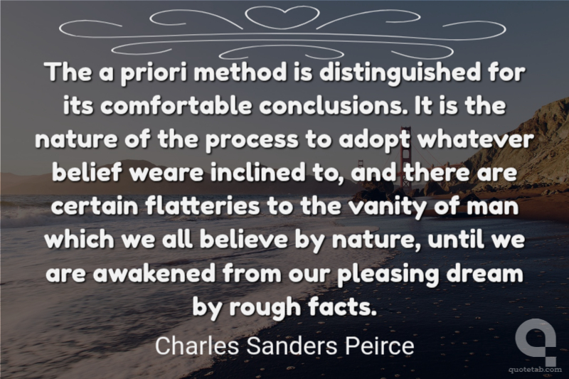 The a priori method is distinguished for its comfortable conclusions. It is the nature of the process to adopt whatever belief weare inclined to, and there are certain flatteries to the vanity of man which we all believe by nature, until we are awakened from our pleasing dream by rough facts.