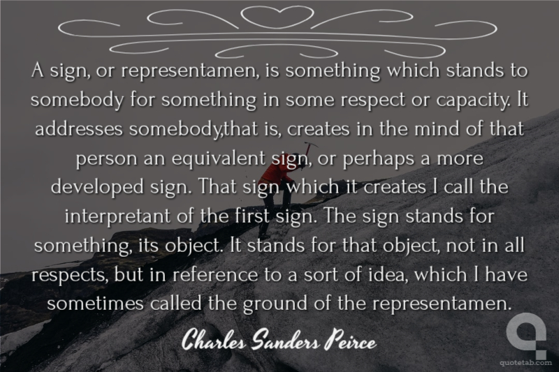 A sign, or representamen, is something which stands to somebody for something in some respect or capacity. It addresses somebody,that is, creates in the mind of that person an equivalent sign, or perhaps a more developed sign. That sign which it creates I call the interpretant of the first sign. The sign stands for something, its object. It stands for that object, not in all respects, but in reference to a sort of idea, which I have sometimes called the ground of the representamen.