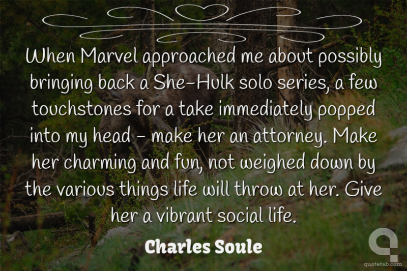 When Marvel approached me about possibly bringing back a She-Hulk solo series, a few touchstones for a take immediately popped into my head - make her an attorney. Make her charming and fun, not weighed down by the various things life will throw at her. Give her a vibrant social life.