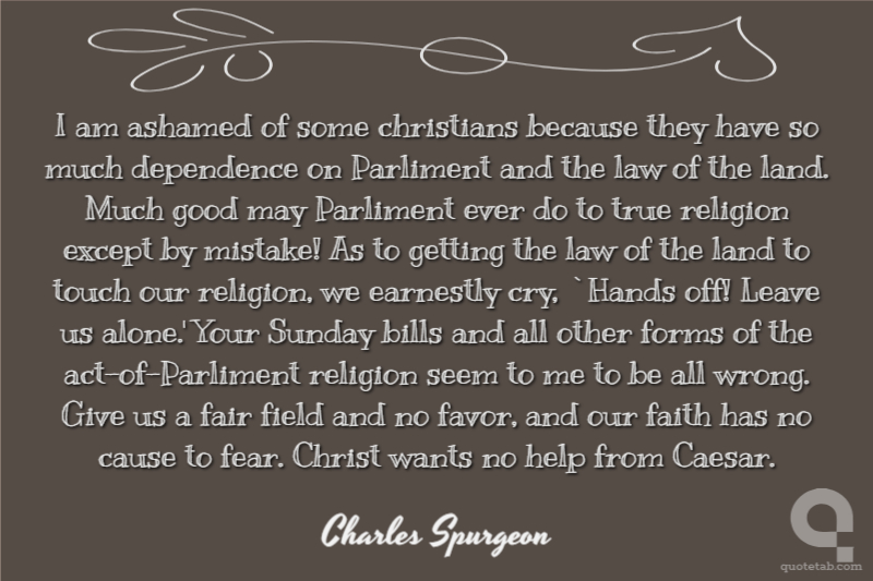 I am ashamed of some christians because they have so much dependence on Parliment and the law of the land. Much good may Parliment ever do to true religion except by mistake! As to getting the law of the land to touch our religion, we earnestly cry, `Hands off! Leave us alone.' Your Sunday bills and all other forms of the act-of-Parliment religion seem to me to be all wrong. Give us a fair field and no favor, and our faith has no cause to fear. Christ wants no help from Caesar.