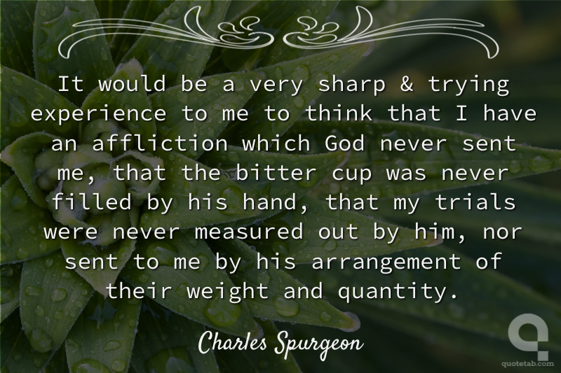 It would be a very sharp & trying experience to me to think that I have an affliction which God never sent me, that the bitter cup was never filled by his hand, that my trials were never measured out by him, nor sent to me by his arrangement of their weight and quantity.