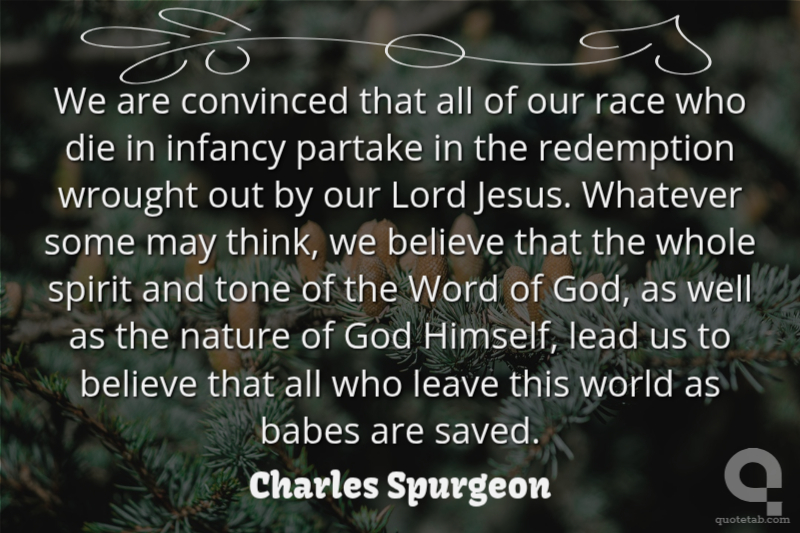 We are convinced that all of our race who die in infancy partake in the redemption wrought out by our Lord Jesus. Whatever some may think, we believe that the whole spirit and tone of the Word of God, as well as the nature of God Himself, lead us to believe that all who leave this world as babes are saved.