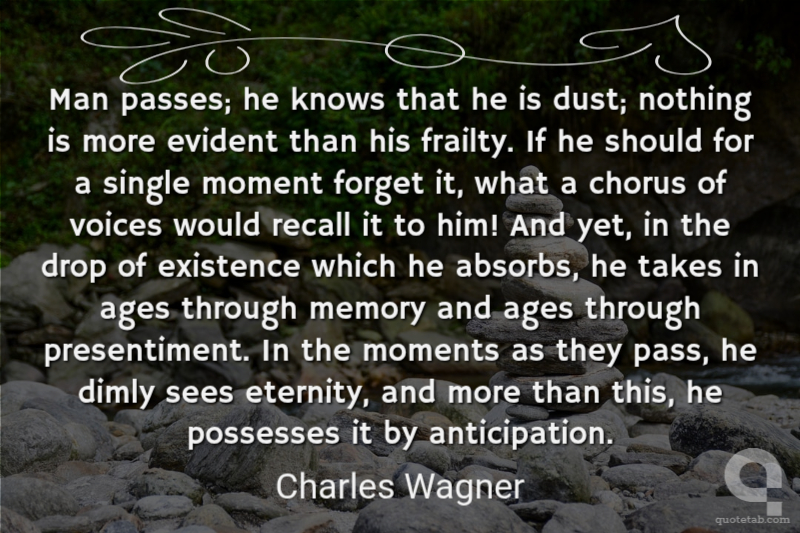 Man passes; he knows that he is dust; nothing is more evident than his frailty. If he should for a single moment forget it, what a chorus of voices would recall it to him! And yet, in the drop of existence which he absorbs, he takes in ages through memory and ages through presentiment. In the moments as they pass, he dimly sees eternity, and more than this, he possesses it by anticipation.